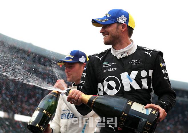 [이데일리 방인권 기자] 14일 서울 송파구 잠실올림픽주경기장 일대에서 열린 '2022 하나은행 서울 E-프리(E-Prix)' 16라운드 본경기에서 우승을 차지한 로킷 벤추리 레이싱의 에도아르도 모르타라(스위스)가 샴페인을 뿌리며 기뻐하고 있다.