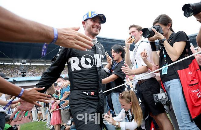 [이데일리 방인권 기자] 14일 서울 송파구 잠실올림픽주경기장 일대에서 열린 '2022 하나은행 서울 E-프리(E-Prix)' 16라운드 본경기에서 우승을 차지한 로킷 벤추리 레이싱의 에도아르도 모르타라(스위스)가 축하를 받으며 시상대로 향하고 있다.
