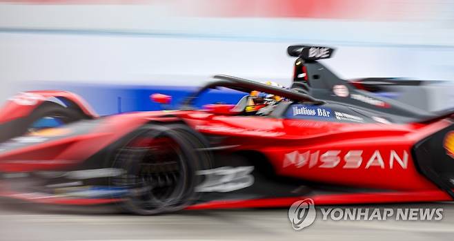 (서울=연합뉴스) 김도훈 기자 = 14일 서울 송파구 잠실올림픽주경기장 일대에서 열린 '2022 하나은행 서울 E-프리(E-Prix)' 16라운드 본경기에서 닛산 e.담스의 세바스티앙 부에미(스위스)가 트랙을 질주하고 있다. 2022.8.14