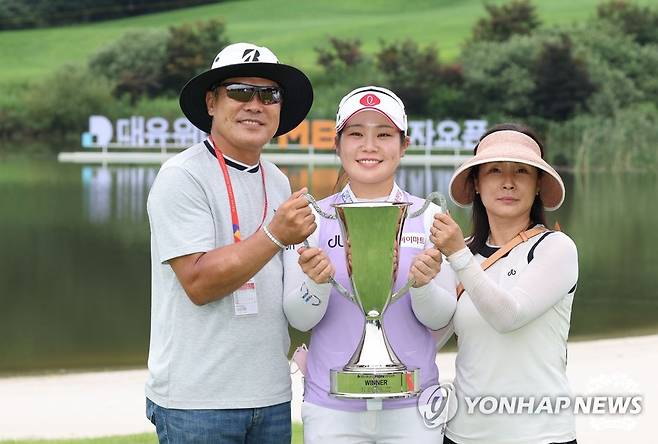 (서울=연합뉴스) 14일 경기도 포천시 대유몽베르 컨트리클럽에서 열린 한국여자프로골프(KLPGA) 투어 대유위니아·MBN 여자오픈 대회에서 우승한 이소영이 우승 트로피를 들고 기념촬영하고 있다. 2022.8.14