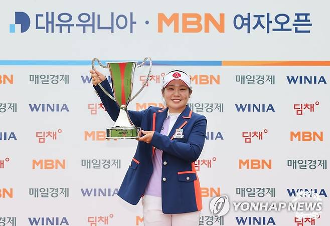 (서울=연합뉴스) 14일 경기도 포천시 대유몽베르 컨트리클럽에서 열린 한국여자프로골프(KLPGA) 투어 대유위니아·MBN 여자오픈 대회에서 우승한 이소영이 우승 트로피를 들고 기념촬영하고 있다. 2022.8.14