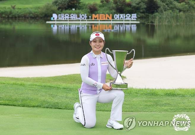 (서울=연합뉴스) 14일 경기도 포천시 대유몽베르 컨트리클럽에서 열린 한국여자프로골프(KLPGA) 투어 대유위니아·MBN 여자오픈 대회에서 우승한 이소영이 우승 트로피를 들고 기념촬영하고 있다. 2022.8.14