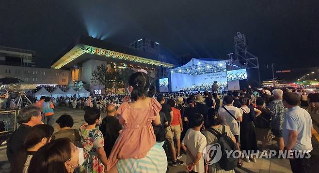 (서울=연합뉴스) 한상균 기자 = 광복절을 하루 앞둔 14일 밤. 시민들이 서울 광화문광장에서 '광복 77주년 기념음악회'를 보고 있다. 2022.8.14
