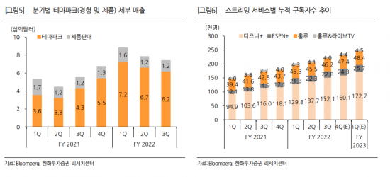 다만 2024년 스트리밍 가입자 수 가이던스를 하향 조정한 것은 아쉬운 부분이다. 2억1500만명~2억4500만명으로 기존 대비 1500만명을 낮췄는데 이는 IPL중계권 계약 연장 실패에 따른 것으로 추정된다. 디즈니 플러스의 가이던스인 1억3500만명, 1억6500만명은 유지됐다. 이기훈 하나증권 연구원은 “BTS 콘텐츠 제공 등 다양한 형식의 로컬 오리지널에 대한 투자 강화와 ESPN+ 등과 번들 중심 성장에 대한 노력이 지속될 것”이라며 “2024년에도 흑자전환 기조는 여전히 유효하다”고 분석했다.