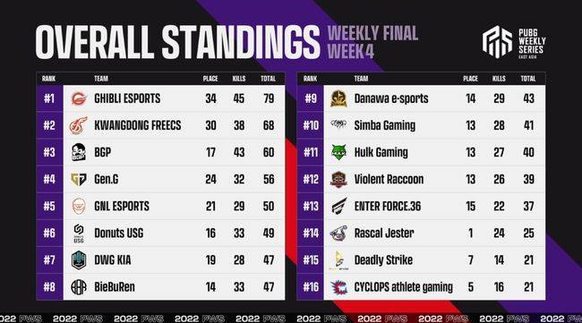 광동은 14일 오후 온라인으로 열린 '2022 펍지 위클리 시리즈(이하 PWS): 페이즈2' 위클리 파이널 4주 2일차 3라운드까지 도합 68점(38킬)을 기록하면서 1위 기블리(79점, 45킬)를 11점 차이로 추격하고 있다.