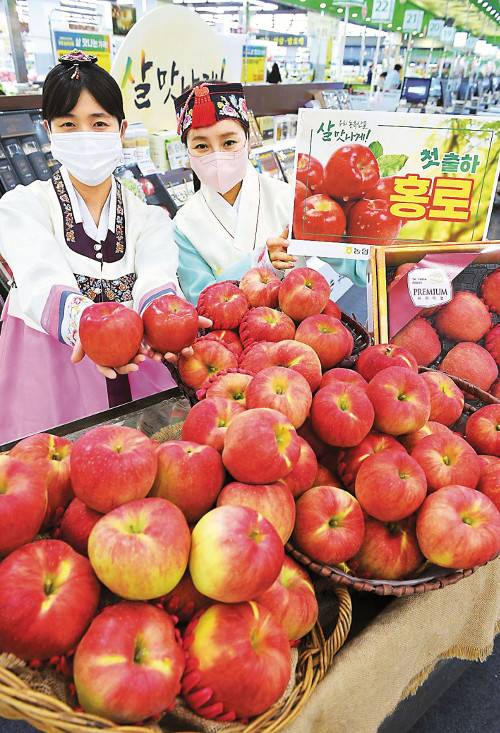 모델들이 14일 올해 처음으로 출하된 '홍로' 사과를 홍보하고 있다. 농협 하나로마트를 운영하는 농협유통은 대표적인 가을 사과 품종인 홍로를 판매한다고 밝혔다.