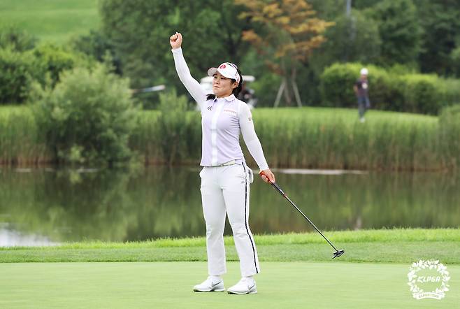 (서울=뉴스1) 신웅수 기자 = 14일 경기 포천 몽베르CC에서 열린 '대유위니아 MBN 여자오픈' 마지막 라운드에서 우승한 이소영이 세리머니를 하고 있다. (KLPGA 제공) 2022.8.12/뉴스1