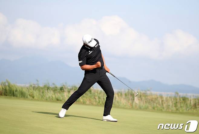 (서울=뉴스1) 신웅수 기자 = 14일 전남 영암군 사우스링스영암(카일필립스코스)에서 열린 우성종합건설 오픈 마지막 라운드에서 우승한 신용구가 환호하고 있다.(KPGA 제공) 2022.8.14/뉴스1
