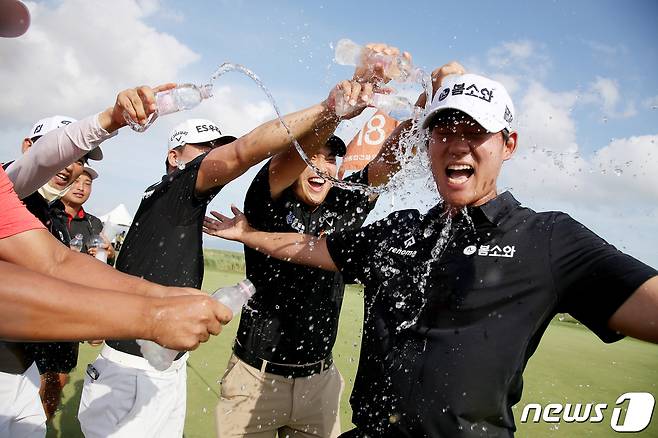 (서울=뉴스1) 신웅수 기자 = 14일 전남 영암군 사우스링스영암(카일필립스코스)에서 열린 우성종합건설 오픈 마지막 라운드에서 우승한 신용구가 환호하고 있다.(KPGA 제공) 2022.8.14/뉴스1