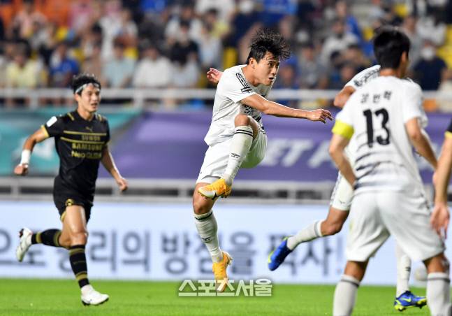 성남 박수일이 14일 수원월드컵경기장에서 열린 2022프로축구 수원삼성과 성남FC의 경기에서 1-2로 추격하는 골을 터트리고 있다. 2022.8.14.