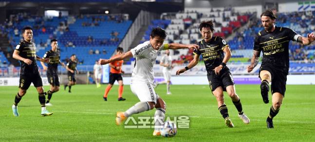 성남 박수일이 14일 수원월드컵경기장에서 열린 2022프로축구 수원삼성과 성남FC의 경기에서 수비를 따돌리며 슈팅을 시도하고 있다. 2022.8.14.