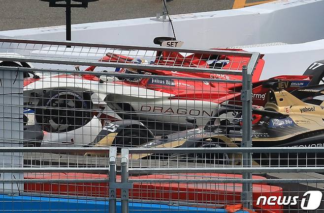 (서울=뉴스1) 구윤성 기자 = 14일 오후 서울 송파구 잠실종합운동장 일원에서 열린 ABB 포뮬러E 챔피언십 시즌8 16라운드 '2022 하나은행 서울 E-Prix(E-프리)' 본선 경기, 1번 코너에서 차량끼리 겹치며 혼선을 빚고 있다. 2022.8.14/뉴스1