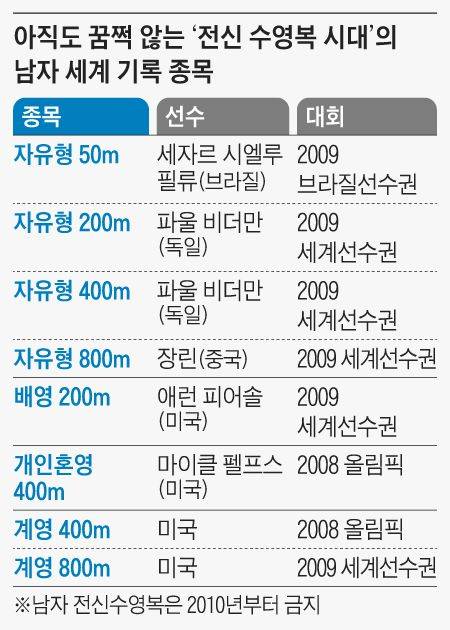 포포비치가 전신수영복 시절의 기록을 깼다는 의미도 크다. 부력을 높여주고, 물의 저항을 줄여주는 전신수영복은 ‘기술 도핑’이라는 논란을 일으켰다. 2009년 로마 세계선수권에선 43개의 세계 기록이 나왔다. 결국 FINA(국제수영연맹)는 2010년부터 전신수영복을 금지했다. 현재 남자 선수는 허리부터 무릎까지 덮는 경기복만 착용할 수 있다. 전신수영복 시대 이후 자유형 100m의 첫 46초대 기록은 2019 광주 세계선수권에서 미국의 케일럽 드레슬이 세운 46초96이었다.
