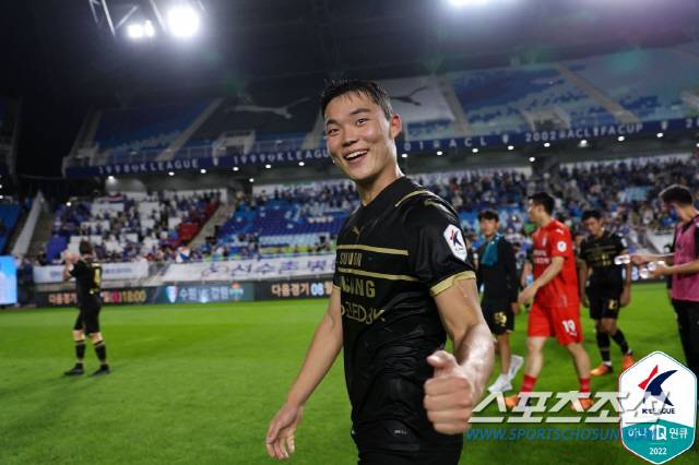 수원 삼성 '투혼의 아이콘' 오현규가 성남FC전 대승 직후 환한 미소로 인터뷰에 응했다.