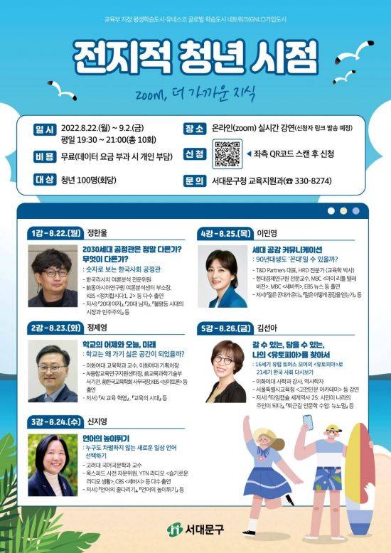 [아시아경제 박종일 기자] 서대문구(구청장 이성헌)가 이달 22일부터 다음 달 2일까지 평일 오후 7시30~9시 온라인 강연 ‘전지적 청년 시점 ? ZOOM, 더 가까운 지식’을 연다.