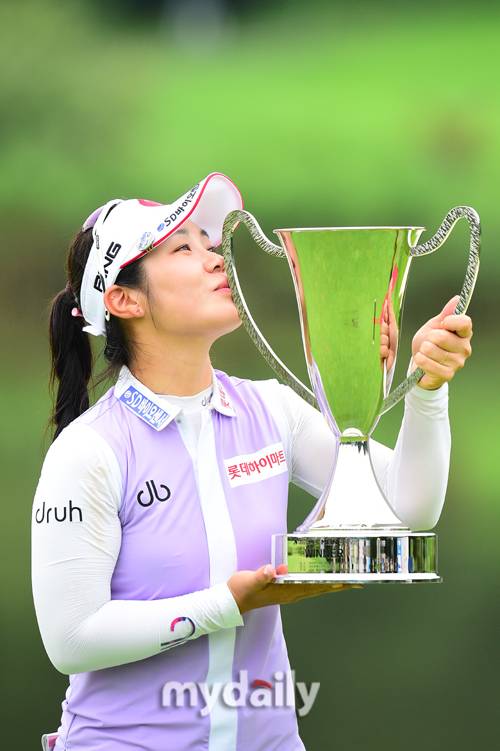 [마이데일리 = 포천 곽경훈 기자] 이소영이 14일 경기도 포천시 대유몽베르 컨트리클럽(파72/6,590야드)에서 진행된 '대유위니아 MBN여자오픈'(총상금 9억 원, 우승상금 1억 6천2백만 원) 3라운드에서 박현경과 2차 연장까지 가는 접전 끝에 시즌 첫 우승을 차지한 뒤 포즈를 취하고 있다.