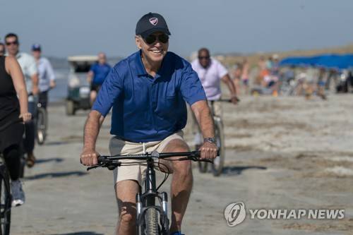 President Joe Biden rides a bicycle along the beach at Kiawah Island, S.C., Sunday, Aug. 14, 2022. Biden is in Kiawah Island with his family on vacation. (AP Photo/Manuel Balce Ceneta)