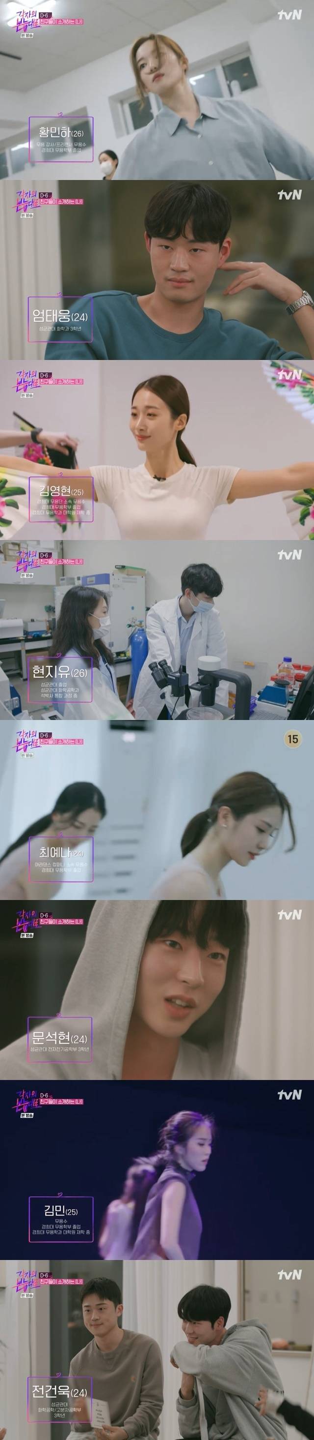 엄태웅은 “24살이다. 하는 일은 성균관대 학생”이라고 자신을 소개했고 문석현은 “태웅이가 외국에서 살다 와서 영어를 잘한다. 4년 정도 살다가 한국에 왔다”고 장점을 말했다. 김영현은 “25살이고 한국무용 전공으로 학교 안 무용단 소속이다. 공연이 있으면 공연 준비하고. 애들 가르치고 싶어 대학원을 나오면 좋겠다 싶어 대학원에 바로 진학하게 됐다”고 밝혔다.