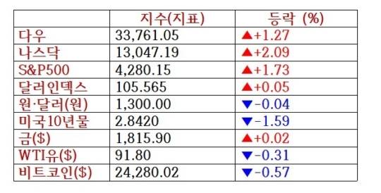 스탠더드앤드푸어스(S&P)500지수는 전장보다 72.88포인트(1.73%) 상승한 4,280.15를 나타냈고, 기술주 중심의 나스닥 지수는 전장보다 267.27포인트(2.09%) 뛴 13,047.19로 장을 마감했다.