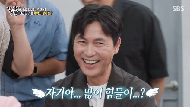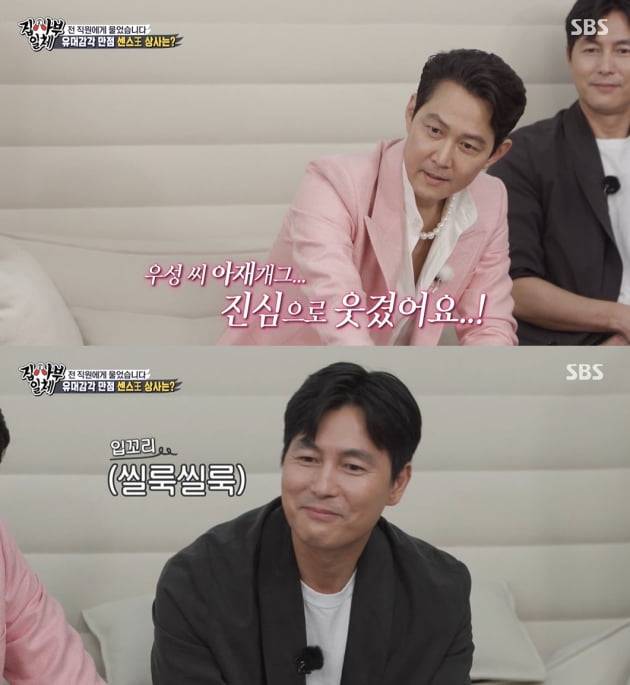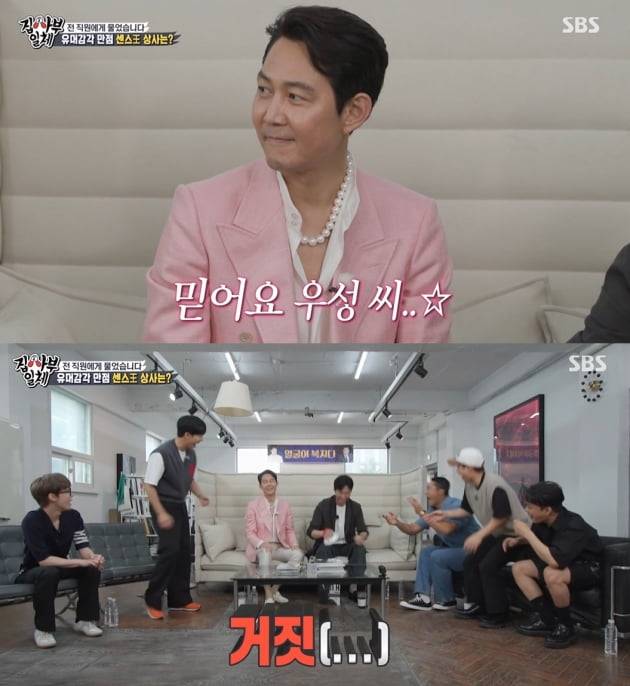 '유머감각 만점 센스王 상사는?'이라는 질문에 앞서 이정재에게 "정우성의 개그가 안 웃겼는데 억지로 웃어준 적 있느냐"라고 던졌다. 이정재는 거짓말 탐지기에 손을 얹고 "없다"고 강조했다. 거짓말 탐자기는 진실로 나왔다. 반면에 정우성은 같은 질문에 거짓으로 나와 폭소를 유발했다.