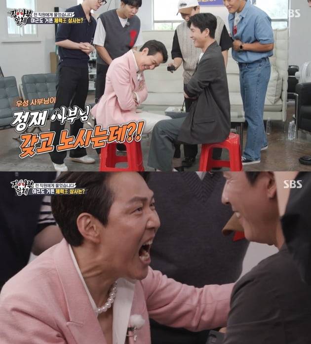 이에 양세형은 "이런 것 때문에 의심스럽게 볼 수 있는 건데 사무실에 이런 의자가 있다는 것도"라며 유난히 등받이가 높은 쇼파를 지적했다. 이어 "회의도 할 수 있고"라고 하자 정우성은 이정재와 붙어 콩트를 시작해 웃음을 안겼다.