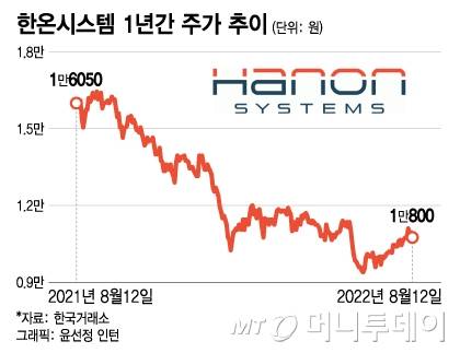 지난 12일 증시에서 한온시스템은 전일 대비 200원(1.82%) 하락한 1만800원에 거래를 마쳤다. 지난해 8월12일(1만6050원)대비 32.71% 하락한 수치다.