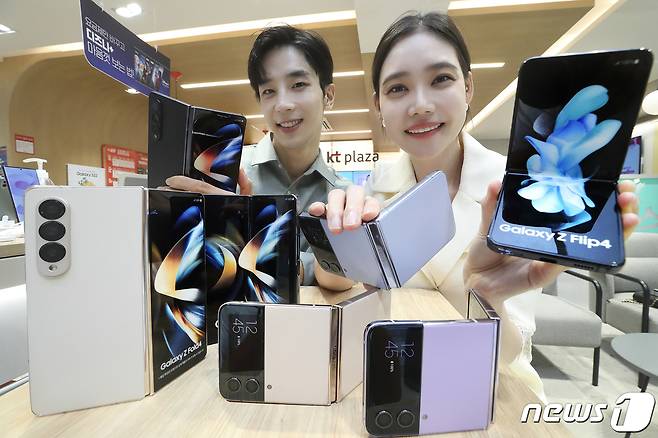 (서울=뉴스1) = KT가 16일부터 22일까지 7일간 전국 KT 매장 및 공식 온라인몰 KT Shop에서 삼성전자 ‘갤럭시 Z폴드·플립4’ 시리즈 사전예약을 진행한다고 15일 밝혔다. 사전예약 개통은 23일부터이며 공식 출시는 26일이다. 사진은 모델들이 삼성전자 폴더블폰 ‘갤럭시 Z 폴드4’와 ‘갤럭시 Z 플립4’ 사전예약을 소개하고 있는 모습. (KT 제공) 2022.8.15/뉴스1
