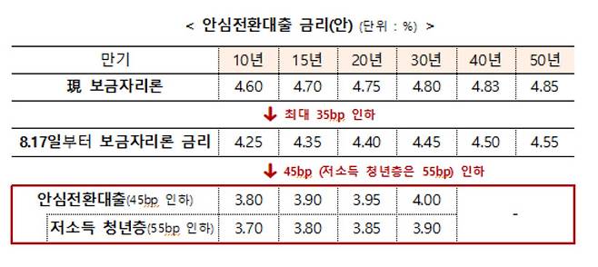 안심전환대출은 1·2금융권에서 받은 변동금리 또는 혼합형 금리 주택담보대출을 주금공의 장기·고정금리로 갈아타는 상품이다. 부부합산 소득 7000만원 이하·주택가격 4억원 이하인 1주택자가 신청할 수 있으며, 기존대출 잔액 범위 내에서 최대 2억5000만원까지 대출할 수 있다. 금리는 u-보금자리론 대비 0.45∼0.55%p 낮은 연 3.8%∼4.0%(만 39세 이하, 소득 6천만원 이하 저소득 청년은 연 3.7%∼3.9%)가 적용된다.