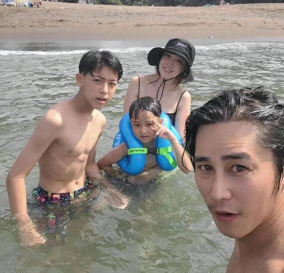 공개된 사진 속 정태우와 아내 장인희, 아들 둘은 바닷가에서 물놀이를 즐기는 모습. 단란한 가족의 모습이 팬들을 감탄하게 만든다.