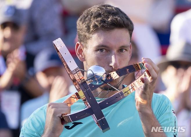 [몬트리올=AP/뉴시스] 파블로 카레노 부스타(23위·스페인)가 14일(현지시간) 캐나다 몬트리올에서 열린 ATP 투어 마스터스 1000시리즈 내셔널뱅크 오픈 단식 결승전에서 후베르트 후르카치(10위·폴란드)를 꺾고 정상에 올라 트로피에 입 맞추고 있다. 카레노 부스타는 후르카치를 2-1(3-6 6-3 6-3)로 꺾고 마스터스 1000시리즈 첫 정상에 올랐다. 2022.08.15.