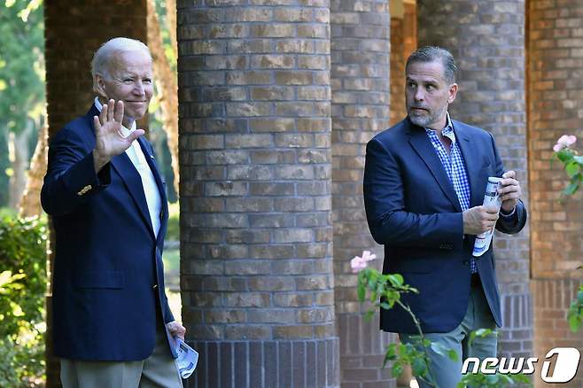 (존스 아일랜드 AFP=뉴스1) 우동명 기자 = 조 바이든 미국 대통령이 13일 (현지시간) 여름 휴가 중 사우스캐롤라이나주 존스 아일랜드에 있는 성당에서 아들 헌터와 미사를 마치고 떠나고 있다.