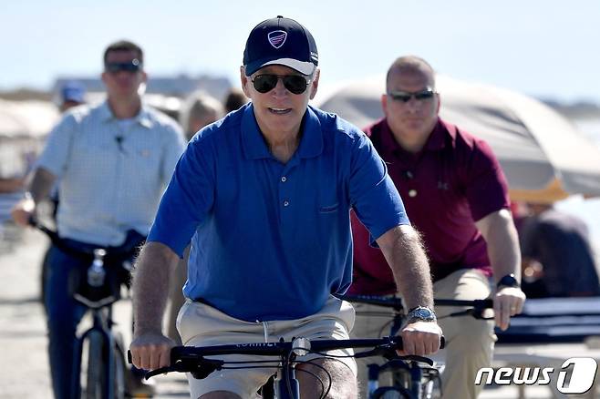 (키아와 아일랜드 AFP=뉴스1) 우동명 기자 = 조 바이든 미국 대통령이 14일 (현지시간) 여름 휴가지인 사우스캐롤라이나주 키아와 아일랜드 아일랜드 해변에서 자전거를 타고 있다.