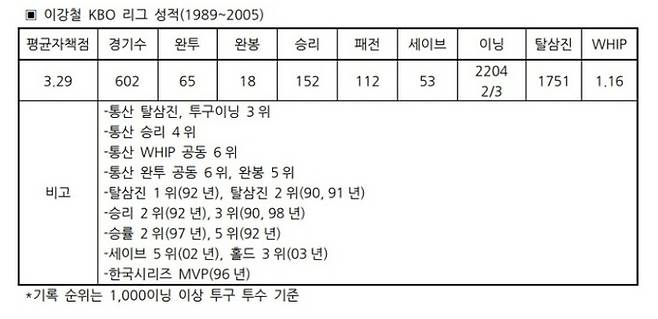 ‘핵잠수함’으로 불렸던 이강철은 데뷔 첫해였던 1989시즌부터 10승과 100탈삼진을 모두 넘어서면서 강인한 인상을 남겼다. 이후 이강철은 1998시즌까지 10시즌 동안 매 시즌 10승과 100탈삼진 이상을 기록, KBO 리그 역대 최다인 10시즌 연속 10승 및 세 자릿수 탈삼진이라는 대기록을 모두 달성한 유일한 투수로 이름을 남겼다. 이강철은 큰 무대에서도 강했다. 1996시즌 한국시리즈에서 현대를 상대로 총 6차전까지 갔던 명승부 중 무려 5경기에 등판했다. 최고의 무대에서 완봉승 1번을 포함한 2승 1세이브 16이닝 13탈삼진 평균자책점 0.56이라는 화려한 기록으로 한국시리즈 MVP로 선정됐다. 이강철은 2005시즌까지 16년간 총 한국시리즈 5번 우승, KBO 리그 통산 승리 4위(152승), 투구이닝 3위(2204.2이닝), 탈삼진 3위(1751탈삼진) 등 굵직한 기록을 남기며 마운드를 떠났다.