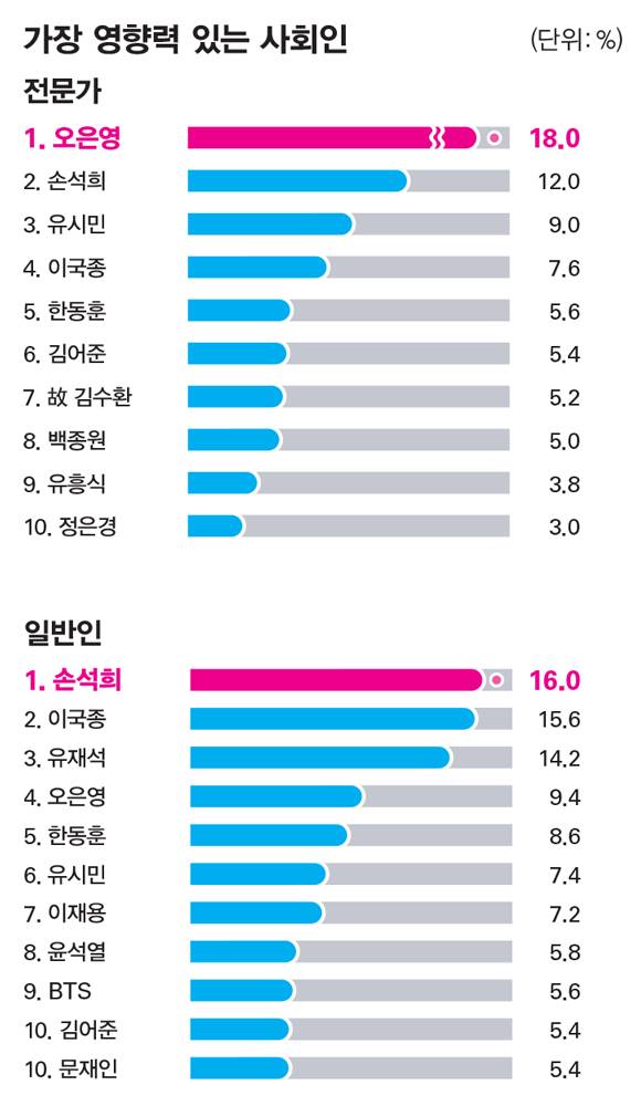 그러나 전문가 설문조사에서는 손 사장의 아성이 흔들렸다. 오은영 박사가 손 사장을 제치고 1위에 오른 것이다. 오 박사의 지목률은 18.0%로 가장 높았다. 손 사장은 지목률 12.0%에 그쳤다. 두 사람의 지목률 차이는 6%포인트였다. 손 사장을 지목한 전문가(60명)보다 30명 많은 90명이 오 박사를 선택한 것이다. 그러나 전문가 조사와 일반인 조사를 합산하면, 손 사장이 받은 지목 수는 140명이었다. 오 박사는 137명의 지목을 받았다.