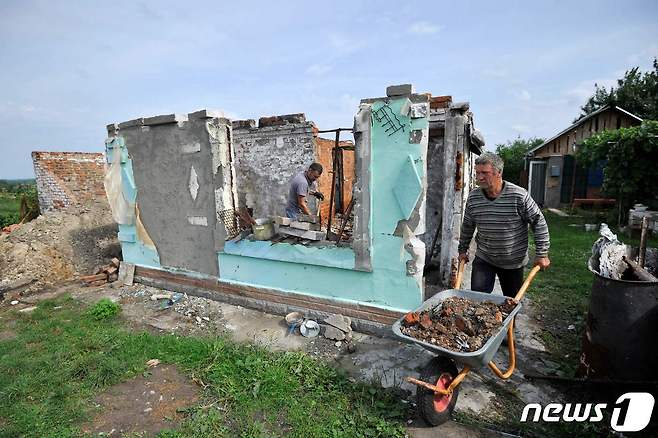 (쿠하리 AFP=뉴스1) 우동명 기자 = 13일 (현지시간) 우크라이나 키이우 인근 쿠하리에서 러시아 군의 포격을 받아 지붕과 벽이 파괴된 주택이 보인다.