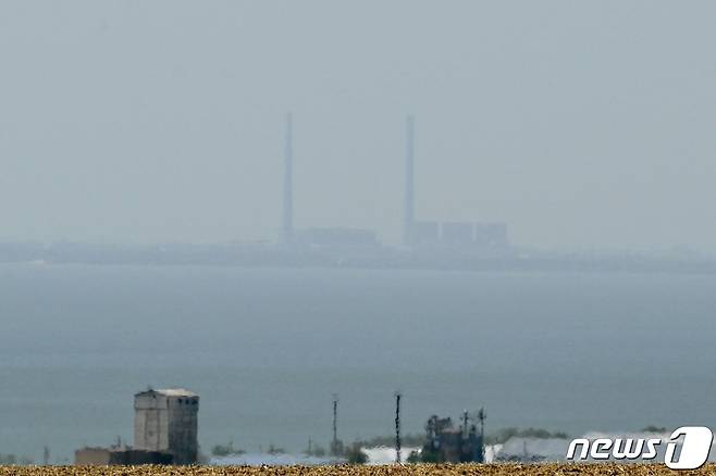 (자포리지야 AFP=뉴스1) 우동명 기자 = 13일 (현지시간) 최근 폭격을 당한 우크라이나 자포리지야 핵 시설이 드니프로 강 건너에 희미하게 보인다.