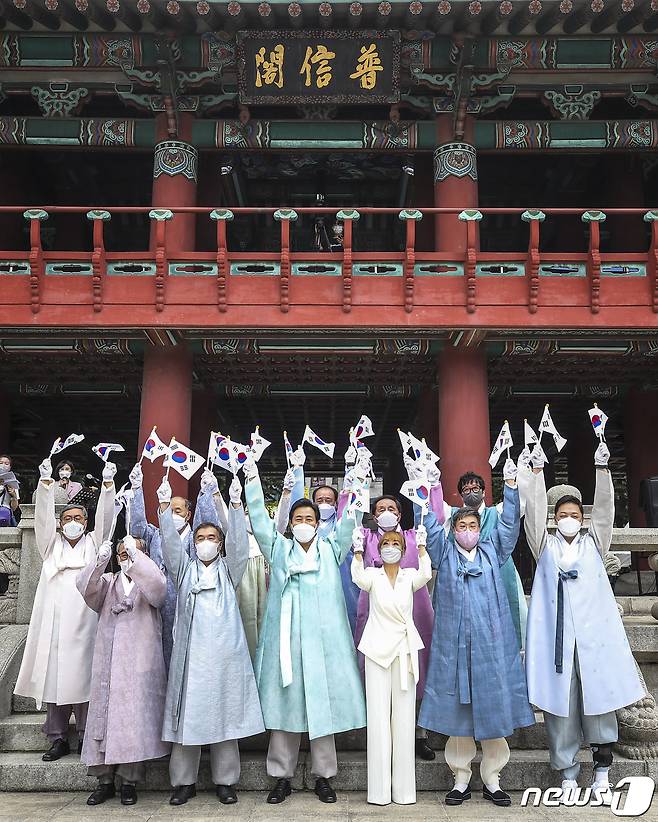 (서울=뉴스1) 구윤성 기자 = 15일 서울 종로구 보신각에 열린 제77주년 광복절 기념 타종 행사에서 오세훈 서울시장, 김현기 서울시의장, 독립유공자 가족, 소프라노 조수미 등 참석자들이 태극기를 흔들고 있다.