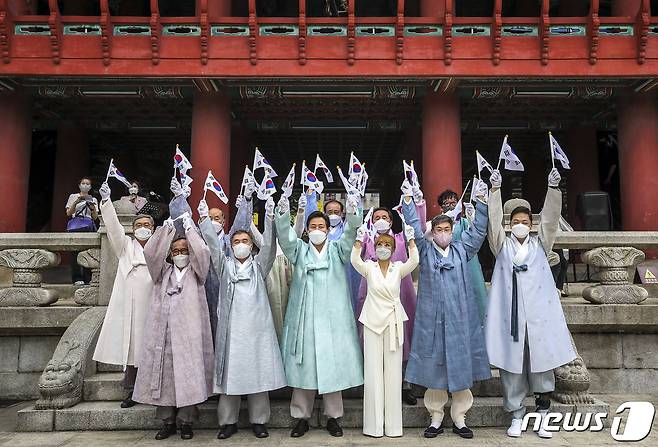 (서울=뉴스1) 구윤성 기자 = 15일 서울 종로구 보신각에 열린 제77주년 광복절 기념 타종 행사에서 오세훈 서울시장, 김현기 서울시의장, 독립유공자 가족, 소프라노 조수미 등 참석자들이 기념촬영을 하고 있다.