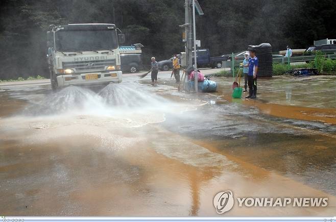 하천 범람으로 쌓인 흙 씻어내는 살수차