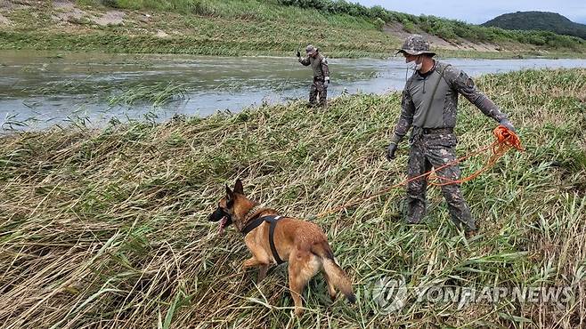 (부여=연합뉴스) 15일 오후 충남 부여군 규암면 하천 변에서 육군 제32사단 장병들이 수색견과 함께 전날 새벽 집중호우 속 급류에 휩쓸린 실종자 2명을 수색하고 있다. 2021.8.15 [제32사단 제공. 재판매 및 DB 금지]