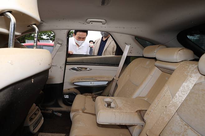 원희룡 국토교통부 장관이 15일 경기도 과천시 서울대공원 주차장에 마련된 침수차 임시적치장에서 피해 차량들을 살펴보고 있다. 원 장관은 "자차보험에 가입되지 않은 침수 차량이 중고차 시장으로 유입될 경우, 국민 안전에 큰 위협이 될 것“이라며 ”이러한 사태를 원천차단하기 위해서는 성능상태점검에서 강화된 검문소 역할이 필요하다"고 강조했다.