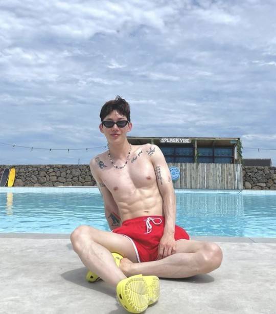 공개된 사진 속 조권은 붉은색 수영복을 입고 상의를 탈의한 채 선명한 식스팩 복근과 군살 없는 근육질 몸매를 자랑하고 있다.