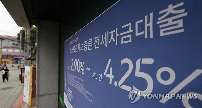 (서울=연합뉴스) 박동주 기자 = 전세 자금 마련을 위해 20·30대가 은행에서 빌린 돈이 100조원에 육박하는 것으로 나타났다. 사진은 15일 오후 서울 한 은행 앞 전세자금대출 관련 안내문. 2022.8.15
