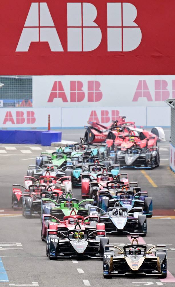 14일 열린 서울 E-PRIX 16라운드 경기에서 드라이버들이 치열한 자리 경쟁을 하고 있다.