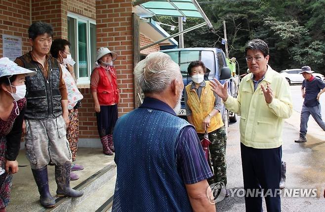 (청양=연합뉴스) 이은파 기자 = 김돈곤 충남 청양군수가 15일 남양면 온직2리 마을회관 앞에서 전날 새벽 폭우로 큰 피해를 본 주민들과 대화하고 있다. 2022.8.15
