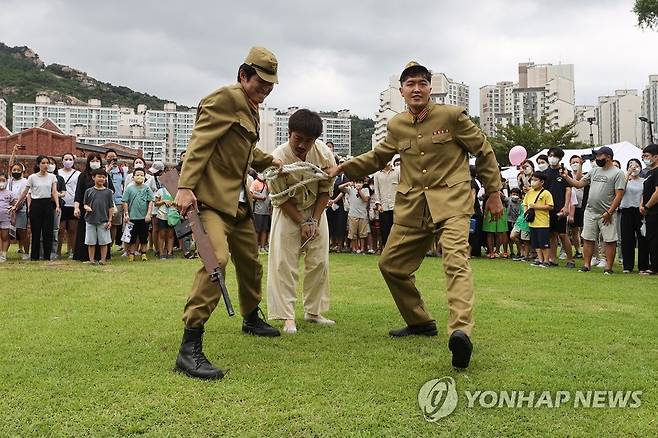 (서울=연합뉴스) 서대연 기자 = 어린이들이 광복절인 15일 서울 서대문구 서대문형무소에서 열린 서대문독립페스타 체험형 프로그램에서 독립군 사형수를 바라보고 있다. 2022.8.15