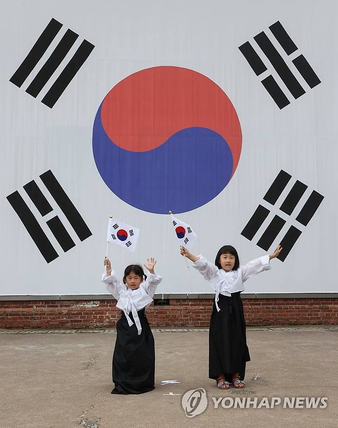 (서울=연합뉴스) 서대연 기자 = 어린이들이 광복절인 15일 서울 서대문구 서대문형무소에서 열린 서대문독립페스타에서 한복을 입고 태극기와 함께 기념사진을 찍고 있다. 2022.8.15
