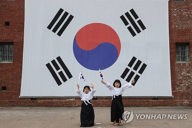 (서울=연합뉴스) 서대연 기자 = 어린이들이 광복절인 15일 서울 서대문구 서대문형무소에서 열린 서대문독립페스타에서 한복을 입고 태극기와 함께 기념사진을 찍고 있다. 2022.8.15
