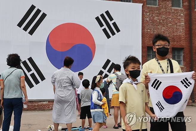 (서울=연합뉴스) 서대연 기자 = 어린이들이 광복절인 15일 서울 서대문구 서대문형무소에서 열린 서대문독립페스타에서 태극기를 들고 기념사진을 찍고 있다. 2022.8.15