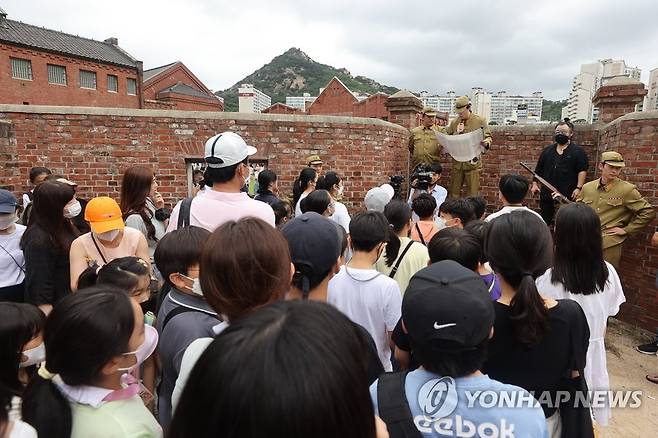 (서울=연합뉴스) 서대연 기자 = 어린이들이 광복절인 15일 서울 서대문구 서대문형무소에서 열린 서대문독립페스타에서 역사 퀴즈에 참여하고 있다. 2022.8.15